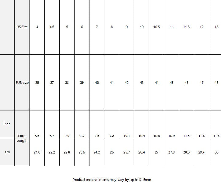 | US Size | 4 | 4.5 | 5 | 6 | 7 | 8 | 9 | 10 | 10.5 | 11 | 11.5 | 12 | 13 | |