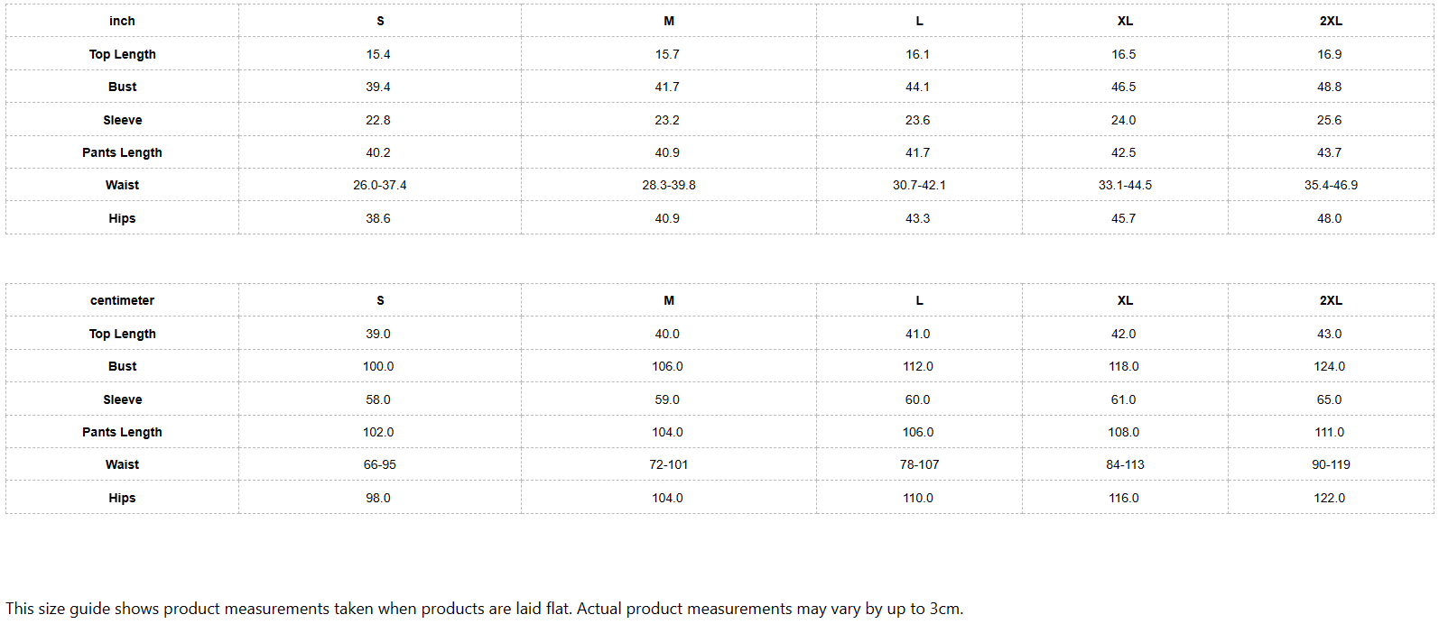 | Pants Length | 102.0 | 104.0 | 106.0 | 108.0 | 111.0 |